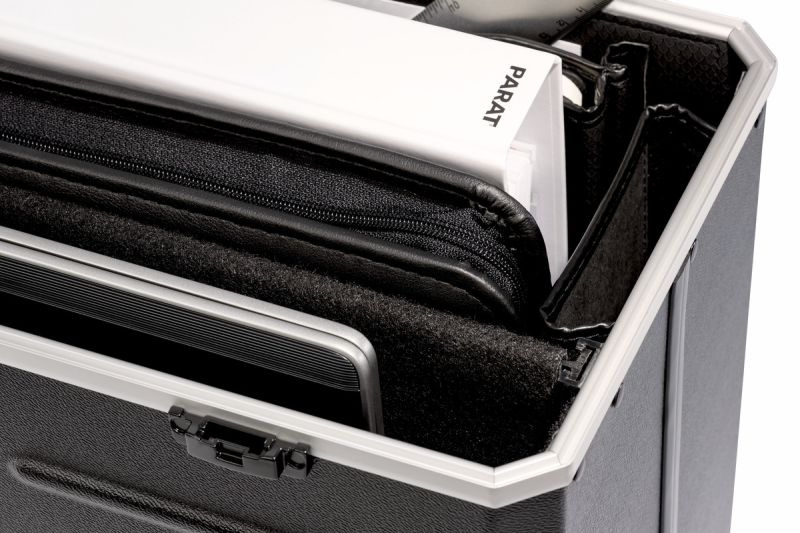 De PARAT PARADOC TronX pilotenkoffer maakt indruk met zijn slimme interieurontwerp. Met een intern volume van circa 29 liter en een extra gewatteerd compartiment voor laptops is deze koffer de ideale reisgenoot voor zakenreizigers. De koffer is gemaakt van duurzaam X-ABS kunststof en beschikt over vier extra opbergvakken in de zijwanden, twee vakjes voor visitekaartjes, pennenhouders en een praktisch insteekvak voor kleine spullen. Dankzij de telescopische handgreep en de praktische, hoogwaardige, soepel rollende wielen met kogellagers is de koffer gemakkelijk te vervoeren, zelfs wanneer hij volledig beladen is. De ergonomische PARAT-handgreep kan volledig in de koffer worden opgeborgen. De PARADOC TronX is ook geschikt als businesscase voor vliegreizigers; dankzij het compacte formaat is hij gemakkelijk mee te nemen als handbagage. Twee afsluitbare sluitingen beschermen de inhoud tegen onbevoegde toegang. De PARADOC TronX is verkrijgbaar in zwart of hoogglans wit.